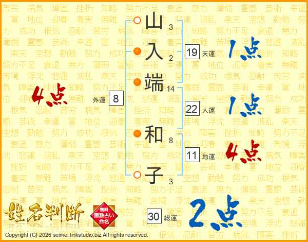 山(3画)入(2画)端(14画) 和(8画)子(3画)