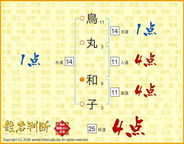 鳥(11画)丸(3画) 和(8画)子(3画)