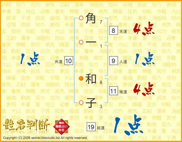 生活面を象徴する運勢です。外部から受ける影響力を表し、結婚運、家庭運や職場、環境への順応性を表します。総運から人運を引いた画数。姓や名が1文字の場合を除く。