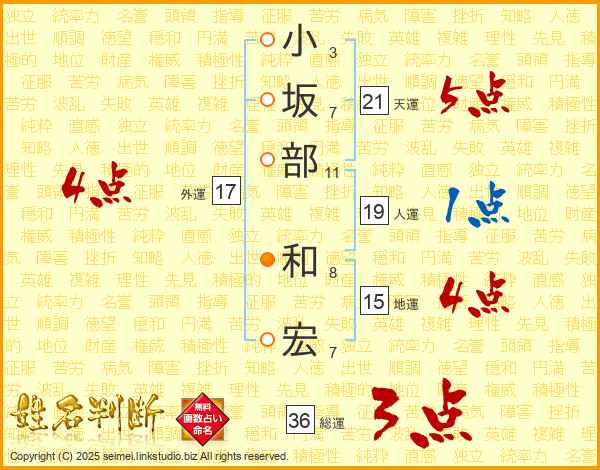 小(3画)坂(7画)部(11画) 和(8画)宏(7画)