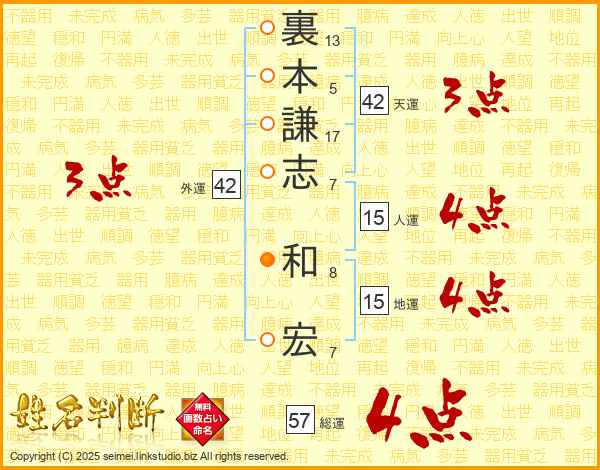 裏(13画)本(5画)謙(17画)志(7画) 和(8画)宏(7画)