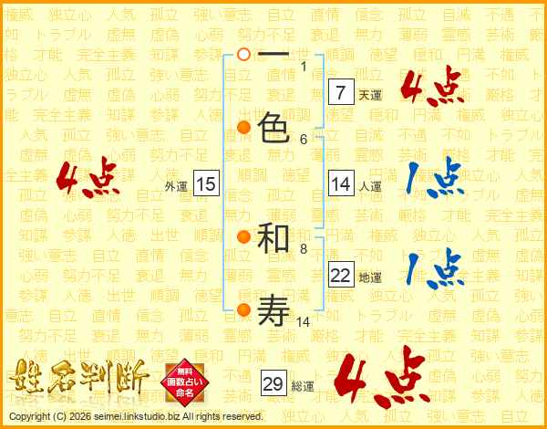 生活面を象徴する運勢です。外部から受ける影響力を表し、結婚運、家庭運や職場、環境への順応性を表します。総運から人運を引いた画数。姓や名が1文字の場合を除く。