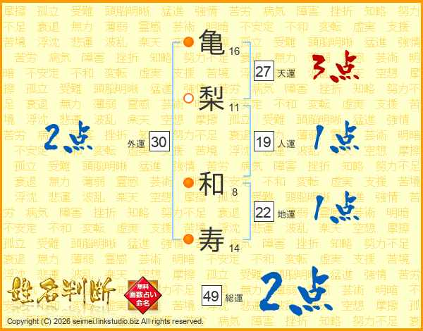亀(16画)梨(11画) 和(8画)寿(14画)