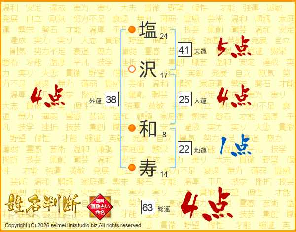 塩(24画)沢(17画) 和(8画)寿(14画)