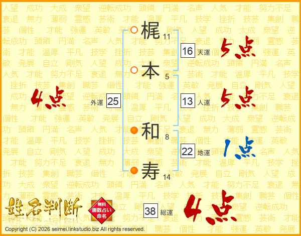 あなたの人生を表す1番重要な運勢です。生涯を通じて影響する総合運となり、主に50歳以降の晩年期に影響を及ぼします。苗字と名前の合計画数。