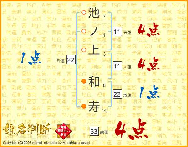 池(7画)ノ(1画)上(3画) 和(8画)寿(14画)