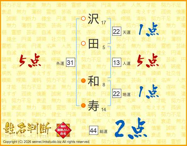 沢(17画)田(5画) 和(8画)寿(14画)