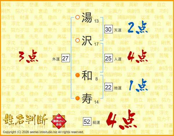 湯(13画)沢(17画) 和(8画)寿(14画)