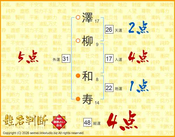 澤(17画)柳(9画) 和(8画)寿(14画)