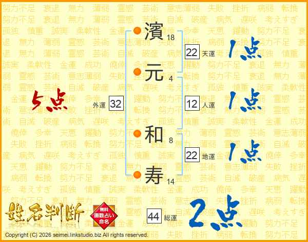 濱(18画)元(4画) 和(8画)寿(14画)