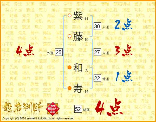 紫(11画)藤(19画) 和(8画)寿(14画)