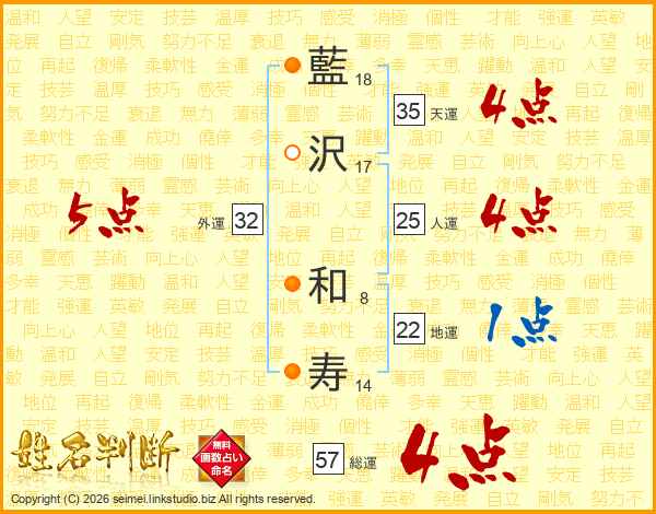 藍(18画)沢(17画) 和(8画)寿(14画)