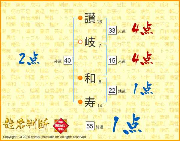 讃(26画)岐(7画) 和(8画)寿(14画)