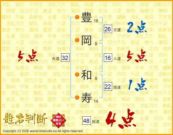 豊(18画)岡(8画) 和(8画)寿(14画)