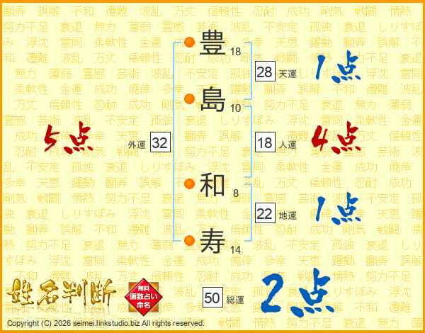 豊(18画)島(10画) 和(8画)寿(14画)