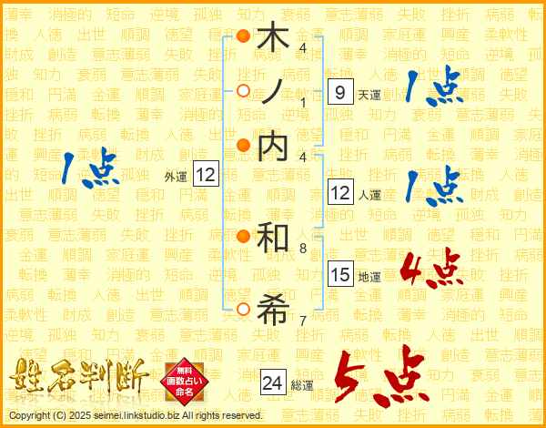木(4画)ノ(1画)内(4画) 和(8画)希(7画)