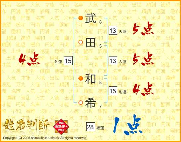 武(8画)田(5画) 和(8画)希(7画)