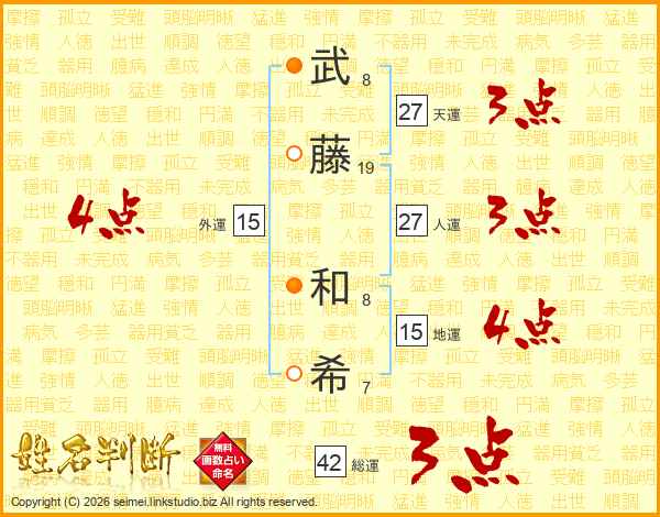 武(8画)藤(19画) 和(8画)希(7画)