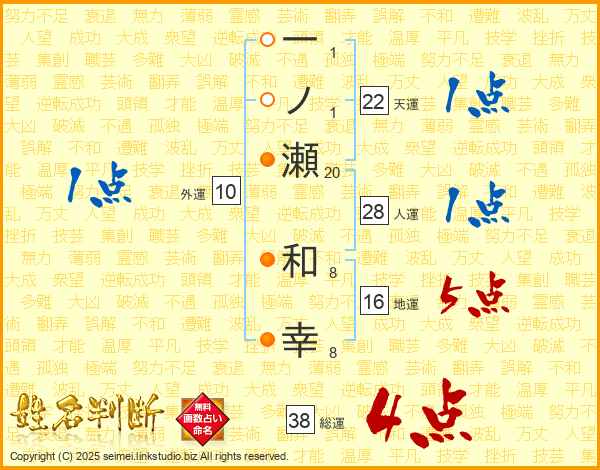 一(1画)ノ(1画)瀬(20画) 和(8画)幸(8画)