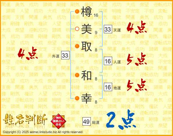 樽(16画)美(9画)取(8画) 和(8画)幸(8画)