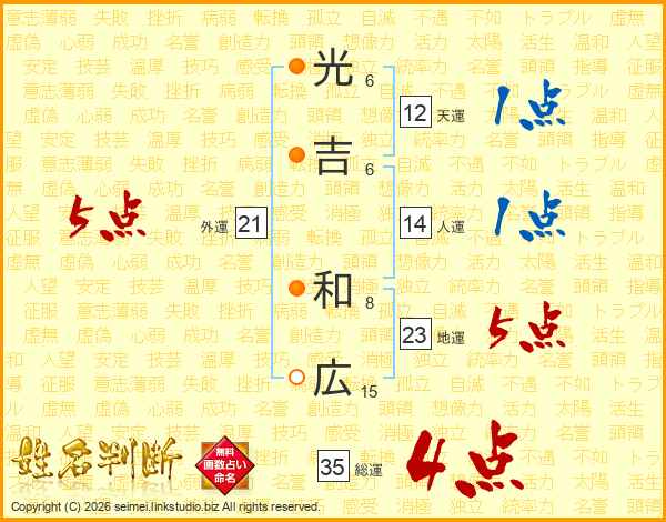生活面を象徴する運勢です。外部から受ける影響力を表し、結婚運、家庭運や職場、環境への順応性を表します。総運から人運を引いた画数。姓や名が1文字の場合を除く。