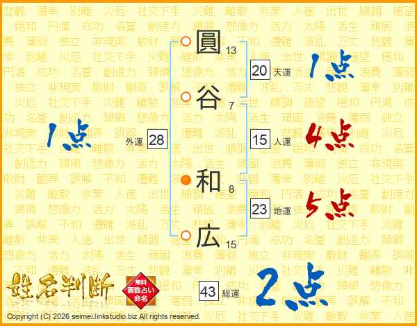 圓(13画)谷(7画) 和(8画)広(15画)