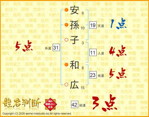 安(6画)孫(10画)子(3画) 和(8画)広(15画)