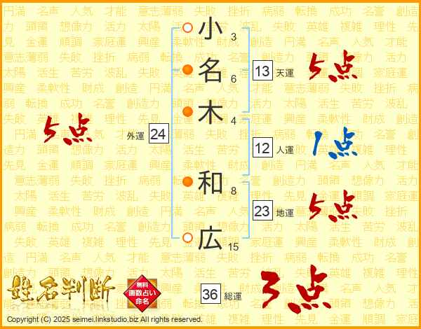 小(3画)名(6画)木(4画) 和(8画)広(15画)