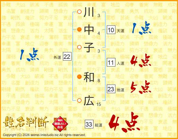 川中子和広さんの総運は33画の4点!