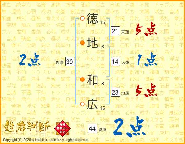徳(15画)地(6画) 和(8画)広(15画)