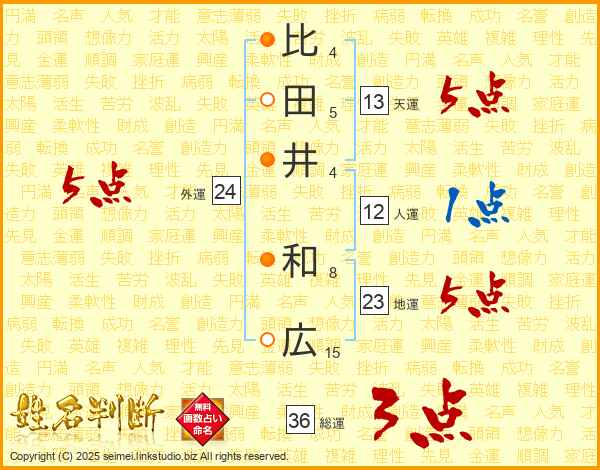 比(4画)田(5画)井(4画) 和(8画)広(15画)