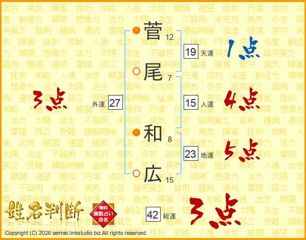 菅(12画)尾(7画) 和(8画)広(15画)