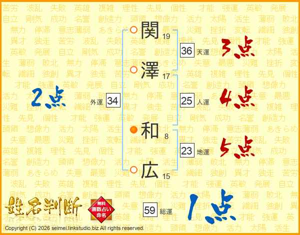 生活面を象徴する運勢です。外部から受ける影響力を表し、結婚運、家庭運や職場、環境への順応性を表します。総運から人運を引いた画数。姓や名が1文字の場合を除く。
