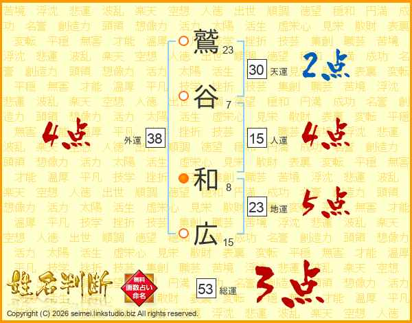 鷲(23画)谷(7画) 和(8画)広(15画)