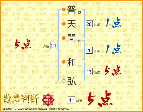普(12画)天(4画)間(12画) 和(8画)弘(5画)