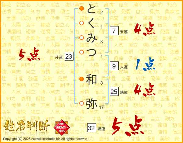 と(2画)く(1画)み(3画)つ(1画) 和(8画)弥(17画)