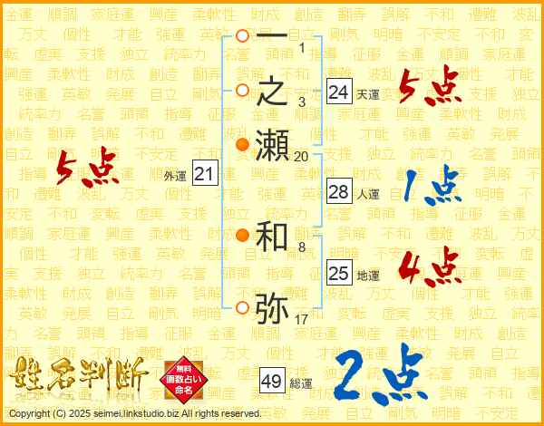 一(1画)之(3画)瀬(20画) 和(8画)弥(17画)