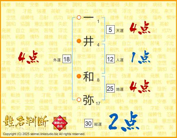 生活面を象徴する運勢です。外部から受ける影響力を表し、結婚運、家庭運や職場、環境への順応性を表します。総運から人運を引いた画数。姓や名が1文字の場合を除く。