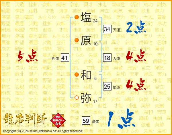 生活面を象徴する運勢です。外部から受ける影響力を表し、結婚運、家庭運や職場、環境への順応性を表します。総運から人運を引いた画数。姓や名が1文字の場合を除く。