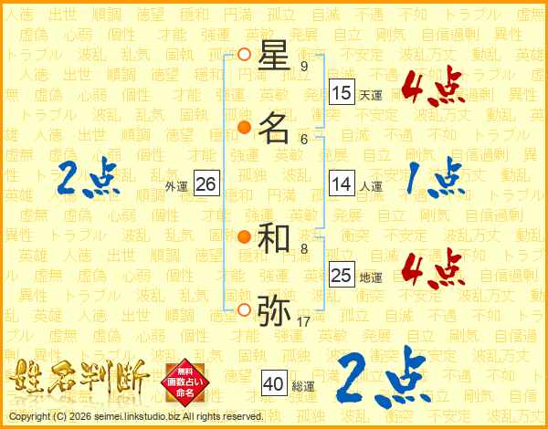 生活面を象徴する運勢です。外部から受ける影響力を表し、結婚運、家庭運や職場、環境への順応性を表します。総運から人運を引いた画数。姓や名が1文字の場合を除く。
