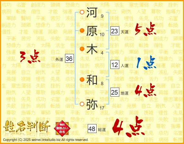 河(9画)原(10画)木(4画) 和(8画)弥(17画)