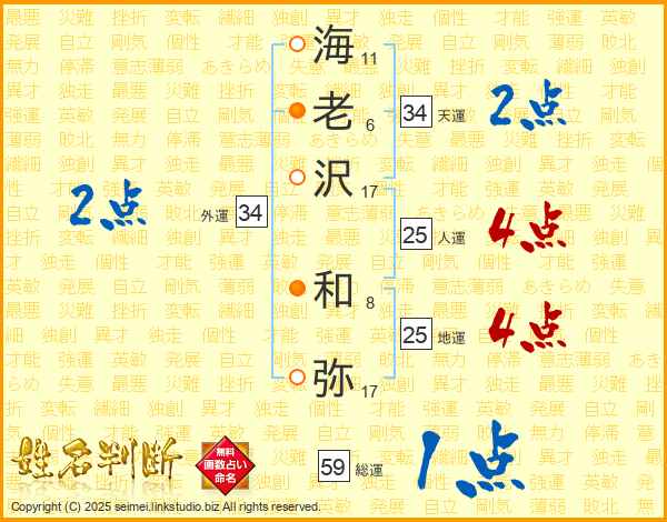 海(11画)老(6画)沢(17画) 和(8画)弥(17画)