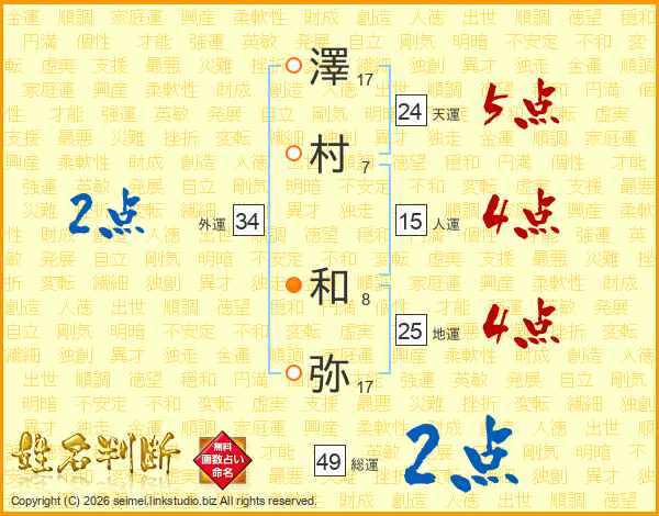 澤(17画)村(7画) 和(8画)弥(17画)