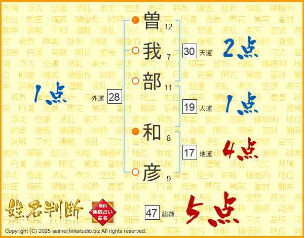 曽(12画)我(7画)部(11画) 和(8画)彦(9画)