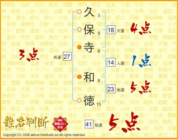 久(3画)保(9画)寺(6画) 和(8画)徳(15画)