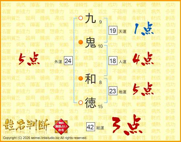九(9画)鬼(10画) 和(8画)徳(15画)