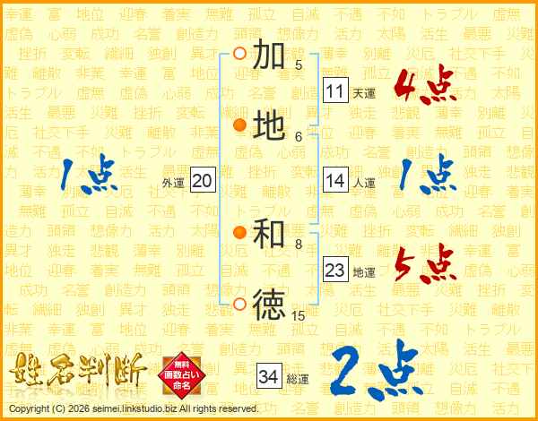 生活面を象徴する運勢です。外部から受ける影響力を表し、結婚運、家庭運や職場、環境への順応性を表します。総運から人運を引いた画数。姓や名が1文字の場合を除く。