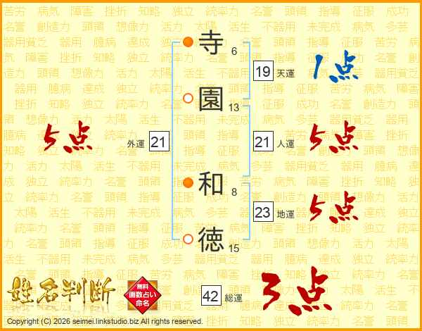 寺(6画)園(13画) 和(8画)徳(15画)
