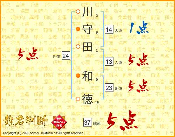 川(3画)守(6画)田(5画) 和(8画)徳(15画)