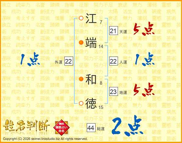 生活面を象徴する運勢です。外部から受ける影響力を表し、結婚運、家庭運や職場、環境への順応性を表します。総運から人運を引いた画数。姓や名が1文字の場合を除く。